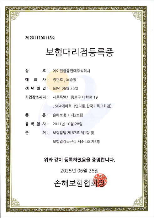에이원금융판매(주) 보험대리점등록증(손해보험) 입니다.